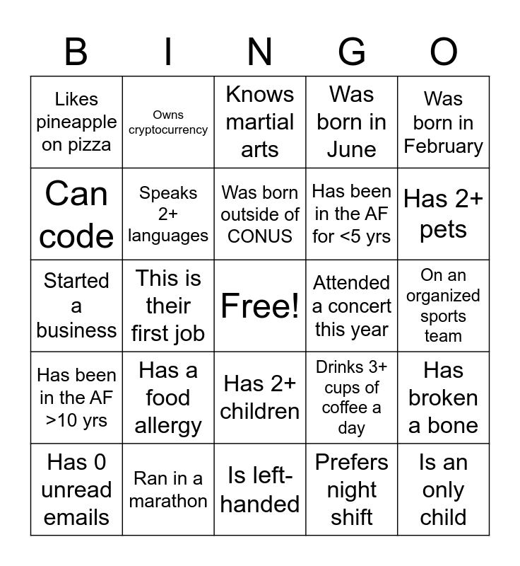 This bingo card has a free space and 29 words: Has 0 unread emails, Has a side hustle, This is their first job, Went viral online, Likes pineapple on pizza, Knows martial arts, Speaks 2+ languages, Has a food allergy, Attended a concert this year, Ran in a marathon, On an organized sports team, Is an only child, Is left-handed, Prefers night shift, Has 2+ pets, Plays a musical instrument, Has 2+ children, Has been in the AF >10 yrs, Was born in February, Started a business, Drinks 3+ cups of coffee a day, Attended a PDC in the past 6 months, Has been in the AF for <5 yrs, Can code, Was born in June, Owns cryptocurrency, Has broken a bone, Was born outside of CONUS and Doesn't have a middle name.