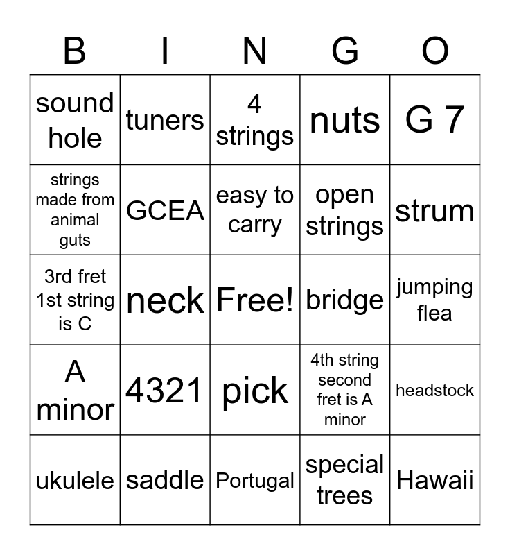 This bingo card has a free space and 29 words: ukulele, 15 frets, neck, body, sound hole, 4 strings, GCEA, 4321, bridge, saddle, jumping flea, Hawaii, Portugal, special trees, strum, pluck, pick, A minor, G 7, 3rd fret 1st string is C, 4th string second fret is A minor, F is second string 1st fret and 4th string 2nd fret, open strings, strings made from animal guts, nuts, tuners, headstock, easy to carry and fun to play.