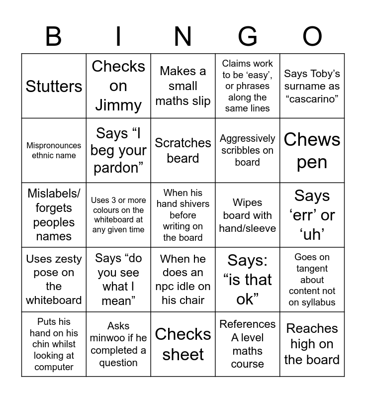 This bingo card has 27 words: Says: “is that ok”, Reaches high on the board, Aggressively scribbles on board, Checks sheet, Mispronounces ethnic name, Makes a small maths slip, Checks on Jimmy, Uses zesty pose on the whiteboard, Wipes board with hand/sleeve, Goes on tangent about content not on syllabus, Mislabels/ forgets peoples names, Claims work to be ‘easy’, or phrases along the same lines, Puts his hand on his chin whilst looking at computer, Asks minwoo if he completed a question, Chews pen, Speedwalks, Says “I beg your pardon”, Scratches beard, Says “do you see what I mean”, Stutters, Says ‘err’ or ‘uh’, References A level maths course, Uses 3 or more colours on the whiteboard at any given time, When his hand shivers before writing on the board, When he does an npc idle on his chair, Says Toby’s surname as “cascarino” and Goes “shh” to try and silence class.