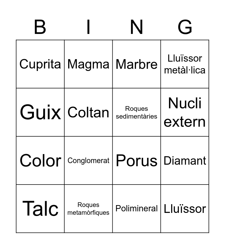This bingo card has 65 words: Geosfera, Gravetat, Escorça continental, Escorça oceànica, Mantell superior, Mantell inferior, Magma, Peridotita, Nucli extern, Nucli intern, Mineral, Monomineral, Polimineral, Guix, Quars, Coltan, Diamant, Cuprita, Bauxita, Color, Color de ratlla, Lluïssor, Lluïssor metàl·lica, Lluïssor vítria, Lluïssor nacrada, Mat, Duresa, Escala de Mohs, Talc, Diamant, Quars, Hàbit, Exfoliació, Roca, Roques magmàtiques, Volcàniques, Plutòniques, Porus, Sediments, Capes, Roques sedimentàries, Fòssil, Roques metamòrfiques, Metamorfització, Argila, Calcària, Conglomerat, Carbó, Petroli, Antracita, Torba, Benzina, Fertilitzant, Granit, Basalt, Pedra tosca, Pissarra, Marbre, A cel obert, Subterrània, Pedrera, Gravera, Halita, Sofre and Obsidiana.
