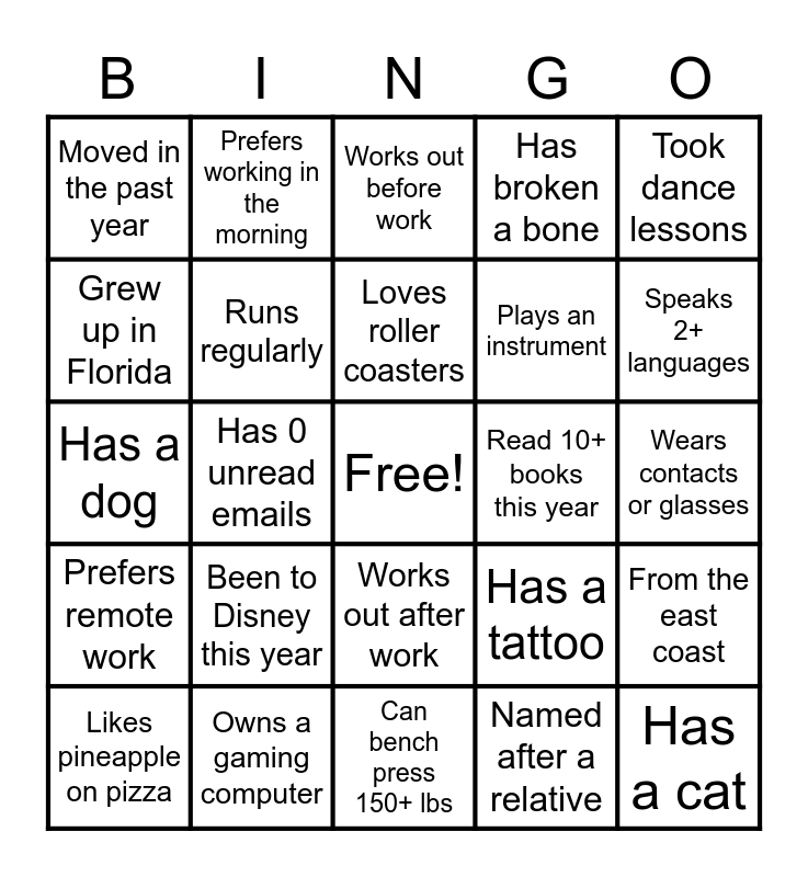 This bingo card has a free space and 24 words: Likes pineapple on pizza, Been to Disney this year, Loves roller coasters, Named after a relative, Took dance lessons, Moved in the past year, Prefers working in the morning, Works out before work, Read 10+ books this year, Wears contacts or glasses, Has a dog, Runs regularly, Has a tattoo, From the east coast, Grew up in Florida, Owns a gaming computer, Can bench press 150+ lbs, Has broken a bone, Speaks 2+ languages, Prefers remote work, Has 0 unread emails, Works out after work, Plays an instrument and Has a cat.