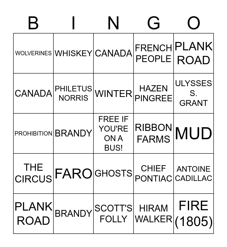 This bingo card has a free space and 49 words: AUGUSTUS WOODWARD, FIRE (1805), FIRE (NOT 1805), SCOTT'S FOLLY, FARO, MUD, WHISKEY, STROH'S, CANADA, CHOLERA, PHILETUS NORRIS, FRENCH PEOPLE, ANTOINE CADILLAC, CHIEF PONTIAC, AMY DOES AN "IMPRESSION", HORSE RACING, WINTER, RIBBON FARMS, FUR TRADE, PLANK ROAD, BRANDY, HIRAM WALKER, WOLVERINES, HAZEN PINGREE, HIRAM WALKER, ULYSSES S. GRANT, PLANK ROAD, UNCLE DANIEL, GHOSTS, THE CIRCUS, CHOLERA, HORSE RACING, RIBBON FARMS, BELA HUBBARD, BRANDY, FIRE (OF 1805), FIRE (NOT 1805), CONRAD TEN EYCK, MUD, SEYMOUR FINNEY, MICHIGAN TERRITORY, RE-BURIALS, ANDREW JACKSON, AMY DOES AN "IMPRESSION", PROHIBITION, CANADA, MONTGOMERY MEIGS, FISHERIES and CIGARS.