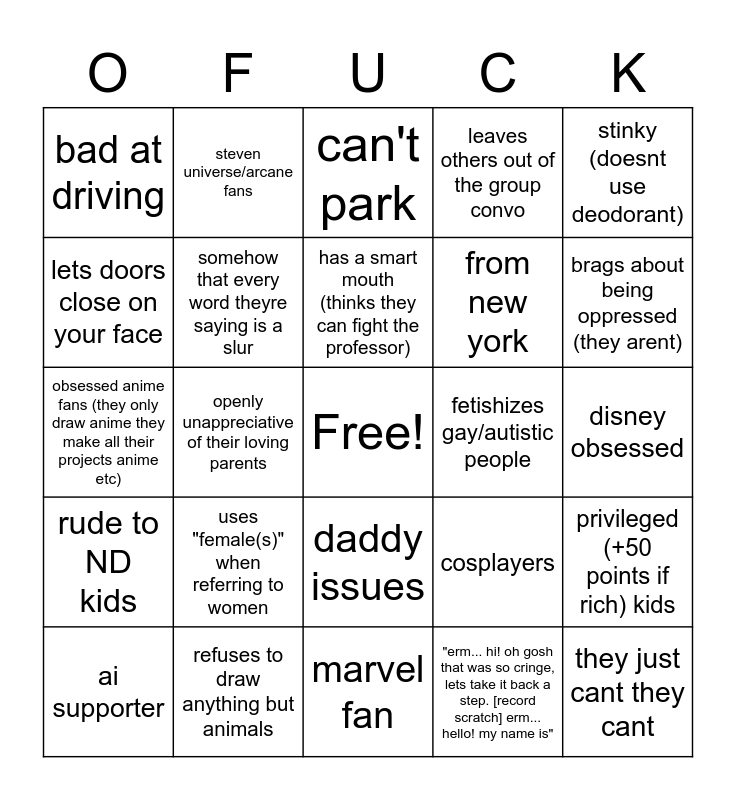 This bingo card has a free space and 24 words: uses "female(s)" when referring to women, refuses to draw anything but animals, has a smart mouth (thinks they can fight the professor), ai supporter, stinky (doesnt use deodorant), bad at driving, lets doors close on your face, steven universe/arcane fans, fetishizes gay/autistic people, daddy issues, from new york, obsessed anime fans (they only draw anime they make all their projects anime etc), cosplayers, privileged (+50 points if rich) kids, somehow that every word theyre saying is a slur, "erm... hi! oh gosh that was so cringe, lets take it back a step. [record scratch] erm... hello! my name is", disney obsessed, can't park, brags about being oppressed (they arent), openly unappreciative of their loving parents, they just cant they cant, rude to ND kids, leaves others out of the group convo and marvel fan.