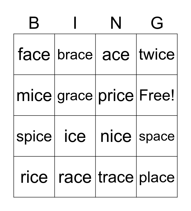 This bingo card has 18 words: ice, place, ace, face, nice, twice, rice, brace, Free!, spice, trace, mice, space, grace, price, lace, race and slice.