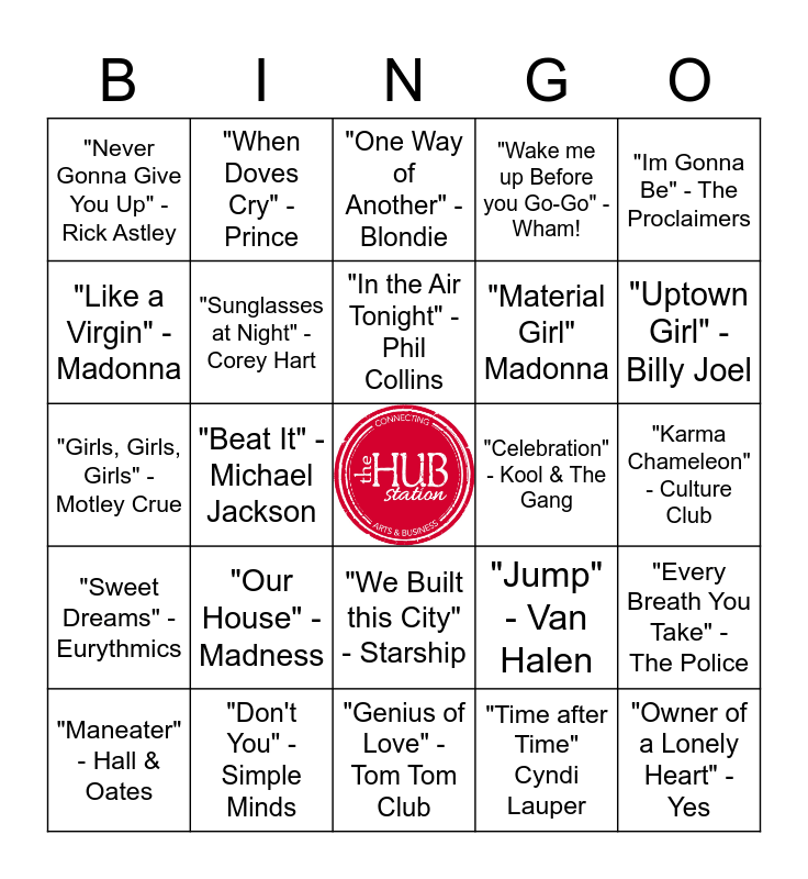 This bingo card has a free space and 69 words: "Take on Me" - a-ha, "Karma Chameleon" - Culture Club, "Tarzan Boy" - Baltimora, "Video Killed the Radio Star" - The Buggles, "Don't You" - Simple Minds, "Billie Jean" - Michael Jackson, "Wake me up Before you Go-Go" - Wham!, "Walking on Sunshine" - Katrina & the Waves, "Im Gonna Be" - The Proclaimers, "Total Eclipse of the Heart" - Bonnie Tyler, "Every Breath You Take" - The Police, "Livin' on a Prayer" - Bon Jovi, "Never Gonna Give You Up" - Rick Astley, "One Way of Another" - Blondie, "Girls Just Want to Have Fun" - Cyndi Lauper, "Beat It" - Michael Jackson, "We Built this City" - Starship, "Material Girl" Madonna, "Hooked on a Feeling" - Blue Swede, "Sweet Dreams" - Eurythmics, "Celebration" - Kool & The Gang, "Jump" - Van Halen, "Uptown Girl" - Billy Joel, "Smooth Criminal" - Michael Jackson, "Kids in America" - Kim Wilde, "Islands in the Stream" -Dolly Parton, Kenny Rogers, "9 to 5" Dolly Parton, "Faith" - George Michael, "Time after Time" Cyndi Lauper, "Call Me" - Blondie, "When Doves Cry" - Prince, "Don't you Want Me" - The Human League, "The Final Countdown" - Europe, "Come on Eileen" - Dexys Midnight Runners, "Running up that Hill" - Kate Bush, "It's my Life" - Talk Talk, "Summer of '69" - Bryan Adams, "Holding out for a Hero" - Bonnie Tyler, "Like a Virgin" -Madonna, "Down Under" Men at Work, "Our House" - Madness, "Owner of a Lonely Heart" - Yes, "Hungry like the Wolf" - Duran Duran, "Mr. Roboto" - Styx, "Holiday Road" - Lindsey Buckingham, "Maneater" - Hall & Oates, "The Boys of Summer" - Don Henley, "Heat of the Moment" - Asia, "Everybody wants to Rule the World" - Tears for Fears, "Sunglasses at Night" - Corey Hart, "In the Air Tonight" - Phil Collins, "Mad World" - Tears for Fears, "I Melt with You" Modern English, "Genius of Love" - Tom Tom Club, "Tainted Love" - Soft Cell, "Footloose" - Kenny Loggins, "Puttin' On the Ritz" - Taco, "Love is a Battlefield" - Pat Benatar, "Rock of Ages" - Def Leppard, "Girls, Girls, Girls" - Motley Crue, "Wanted Dead of Alive" - Bon Jovi, "Pour some Sugar on Me" - Def Leppard, "Sweet Child O' Mine" Guns N' Roses, "Free Fallin'" - Tom Petty, "Rock you like a Hurricane" - Scorpions, "We're not going to take it" - Twisted Sisters, "Fight for your right" - Beastie Boys, "Start me up" - The Rolling Stones and "Back in Black" - AC/DC.