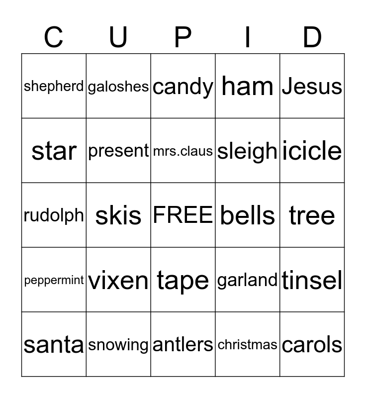 This bingo card has a free space and 24 words: vixen, snowing, mrs.claus, santa, Jesus, shepherd, star, galoshes, bells, tape, sleigh, rudolph, garland, tinsel, present, christmas, tree, candy, icicle, skis, carols, peppermint, ham and antlers.