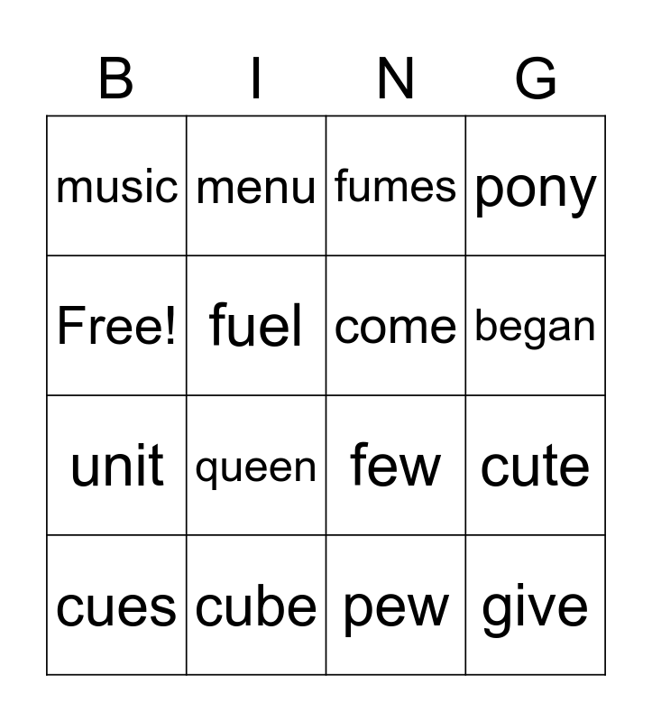 This bingo card has 16 words: cube, cute, fumes, music, unit, menu, few, pew, Free!, fuel, cues, pony, queen, began, come and give.