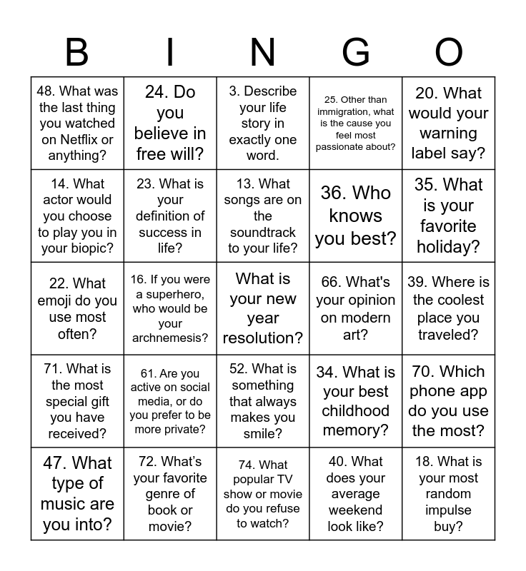 This bingo card has a free space and 75 words: 1. What is the most ridiculous nightmare you have ever had?, 2.. Explain an inside joke you have with a friend or family member., 3. Describe your life story in exactly one word., 4. What is the strangest coincidence that ever happened to you?, 5. What is your favorite random fact?, 6. What is your useless talent?, 7. What is the strangest food combination you enjoy?, 8. If you could travel to the past and change one event, would you? Which one? Why?, 9. If you could choose one superpower, what would it be?, 10. What is your strangest irrational fear?, 11. What is the worst advice you have ever received?, 12. Have you ever met a celebrity? Which celebrity would you like to meet?, 13. What songs are on the soundtrack to your life?, 14. What actor would you choose to play you in your biopic?, 15. What is your go-to karaoke song?, 16. If you were a superhero, who would be your archnemesis?, 17. What area of your life would you most like to improve?, 18. What is your most random impulse buy?, 19. What did you do as a teenager that makes you cringe now?, 20. What would your warning label say?, 21. What is your guilty pleasure?, 22. What emoji do you use most often?, 23. What is your definition of success in life?, 24. Do you believe in free will?, 25. Other than immigration, what is the cause you feel most passionate about?, 26. What is the best Halloween costume you ever wore?, 27. What is the most ridiculous thing you believed as a child?, 28. What is the most outrageous lie you told a child?, 29. What is the dumbest way you injured yourself?, 30. How do you waste time most often?, 31. What is the worst outfit you ever wore?, 32. What is on your bucket list?, 33. What is your favorite recent memory?, 34. What is your best childhood memory?, 35. What is your favorite holiday?, 36. Who knows you best?, 37. What family member are you closest to?, 38. What skill would you most like to learn?, 39. Where is the coolest place you traveled?, 40. What does your average weekend look like?, 41. Tell me about your longest running friendship with someone?, 42. What is your earliest memory?, 43. What makes you unique?, 44. Who is your hero?, 45. Who is the smartest person you ever met?, 46. What is one thing that instantly makes your day better?, 47. What type of music are you into?, 48. What was the last thing you watched on Netflix or anything?, 49. What is your pet peeves?, 50. Aside from necessities, what one thing could you not go a day without?, 51. What do you enjoy spending money on?, 52. What is something that always makes you smile?, 53. What are you most thankful for last year?, 54. What are you most looking forward to this year?, 55. What do you wish more people would understand about you?, 56. What is the biggest risk you ever took?, 57. How do you spend your time off work?, 58. What was the last book you read or you are currently reading?, 59. Do you believe in astrology? Why or why not?, 60. Where do you get your news?, 61. Are you active on social media, or do you prefer to be more private?, 62. Do you think our dreams have hidden meanings?, 63. If you could live anywhere in the world, where would it be?, 64. Do you believe in ghosts—why or why not? If so, are you afraid of ghosts?, 65. What is your weirdest or most sublime shower thought?, 66. What's your opinion on modern art?, 67. If you could change anything about your past, would you? If so, what and why?, 68. What is that one thing you will never do again?, 69. Which book or movie character do you relate to?, 70. Which phone app do you use the most?, 71. What is the most special gift you have received?, 72. What’s your favorite genre of book or movie?, 73. What fictional place would you most like to go?, 74. What popular TV show or movie do you refuse to watch? and 75. What question would you most like to know the answer to?.