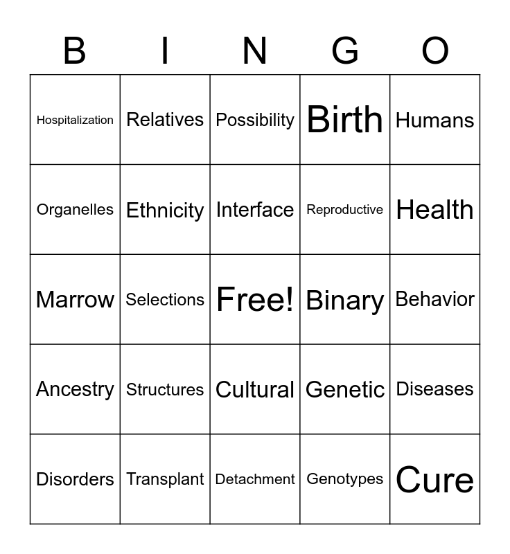 This bingo card has a free space and 24 words: Structures, Transplant, Interface, Disorders, Humans, Hospitalization, Organelles, Relatives, Binary, Cultural, Reproductive, Marrow, Genetic, Diseases, Ethnicity, Genotypes, Behavior, Possibility, Health, Selections, Cure, Ancestry, Birth and Detachment.