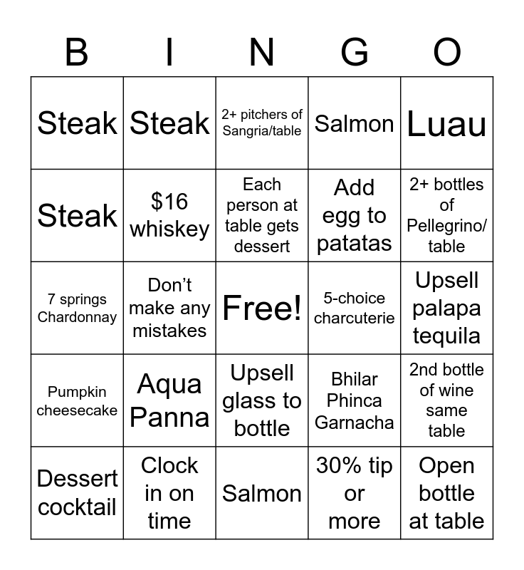 This bingo card has a free space and 24 words: Aqua Panna, Clock in on time, Each person at table gets dessert, Dessert cocktail, Luau, Steak, Steak, Steak, 5-choice charcuterie, Upsell glass to bottle, Add egg to patatas, 7 springs Chardonnay, Bhilar Phinca Garnacha, 2nd bottle of wine same table, $16 whiskey, 30% tip or more, Upsell palapa tequila, 2+ pitchers of Sangria/table, 2+ bottles of Pellegrino/ table, Don’t make any mistakes, Open bottle at table, Pumpkin cheesecake, Salmon and Salmon.