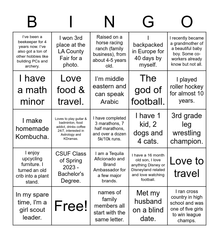 This bingo card has 30 words: Free!, I have been Sky Diving, Loves to play guitar & badminton, food addict, drinks coffee 24/7, interested in Astrology and KDramas., I am an avid gamer who is actually not very good at gaming., I’ve been a beekeeper for 4 years now. I’ve also got a ton of other hobbies like building PCs and archery., Raised on a horse racing ranch (family business), from about 4-5 years old., Love food & travel., I am a Tequila Aficionado and Brand Ambassador for a few major brands., I have 1 kid, 2 dogs and 4 cats., names of family members all start with the same letter., 3rd grade leg wrestling champion., I have completed 3 marathons, 7 half marathons, and over a dozen 5k/10k runs., Met my husband on a blind date., I ran cross country in high school and was one of five girls to win league champs., I played roller hockey for almost 10 years., I'm an avid peloton cycling rider., I have a 16 month old son, I love anything Disney or Disneyland related and love watching football., I enjoy upcycling furniture. I turned an old crib into a plant stand., CSUF Class of Spring 2023 - Bachelor's Degree., I recently became a grandmother of a beautiful baby boy. Some co-workers already know but not all., I make homemade Kombucha., Proud mom of two super cute guineapigs., I won 3rd place at the LA County Fair for a photo., The god of football., I have a math minor, I backpacked in Europe for 40 days by myself., Love to travel, In my spare time, I'm a girl scout leader., I’m middle eastern and can speak Arabic and I collect Starbucks tumblers. :).