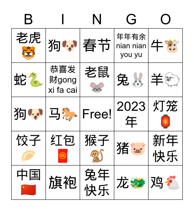 This bingo card has a free space and 24 words: ็บขๅ ๐งง, ๆ่ข, ่้ผ ๐ญ, ไธญๅฝ๐จ๐ณ, ็๐ฎ, ่่๐ฏ, ่๐, ็๐ถ, 2023ๅนด, ็ดๅญ๐, ๅ ๐ฐ, ็๐ถ, ็ช๐ท, ๆฐๅนดๅฟซไน, ๆญๅๅ่ดขgong xi fa cai, ้พ๐ฒ, ็ฏ็ฌผ๐ฎ, ๆฅ่, ็พ๐, ้ฉฌ๐, ้ธก๐, ้ฅบๅญ๐ฅ, ๅนดๅนดๆไฝnian nian you yu and ๅ ๅนดๅฟซไน.