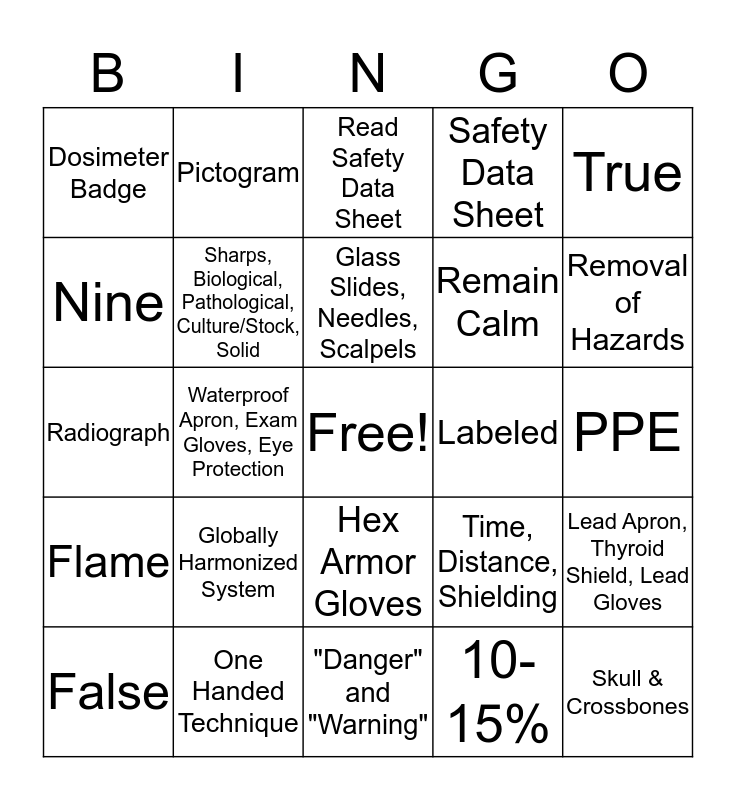 This bingo card has a free space and 24 words: Globally Harmonized System, One Handed Technique, Glass Slides, Needles, Scalpels, False, True, Dosimeter Badge, Nine, Pictogram, Labeled, Hex Armor Gloves, Remain Calm, Radiograph, Time, Distance, Shielding, Lead Apron, Thyroid Shield, Lead Gloves, Sharps, Biological, Pathological, Culture/Stock, Solid, 10-15%, PPE, Read Safety Data Sheet, Removal of Hazards, Waterproof Apron, Exam Gloves, Eye Protection, Skull & Crossbones, Flame, Safety Data Sheet and "Danger" and "Warning".