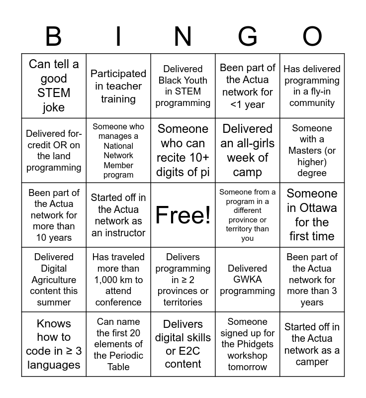 This bingo card has a free space and 27 words: Delivered GWKA programming, Delivered or participated in land camps, Delivered an all-girls week of camp, Delivers digital skills or E2C content, Delivered for-credit OR on the land programming, Delivered Black Youth in STEM programming, Participated in teacher training, Delivered Digital Agriculture content this summer, Someone from a program in a different province or territory than you, Been part of the Actua network for more than 3 years, Been part of the Actua network for more than 10 years, Been part of the Actua network for <1 year, Knows how to code in ≥ 3 languages, Can name the first 20 elements of the Periodic Table, Someone with a Masters (or higher) degree, Someone who has an engineering degree, Someone who manages a National Network Member program, Someone who can recite 10+ digits of pi, Has traveled more than 1,000 km to attend conference, Can tell a good STEM joke, Someone in Ottawa for the first time, Someone signed up for the Phidgets workshop tomorrow, Started off in the Actua network as an instructor, Started off in the Actua network as a camper, Delivers programming in ≥ 2 provinces or territories, Has delivered programming in a fly-in community and Their Network Member delivers programming in >15 communities.