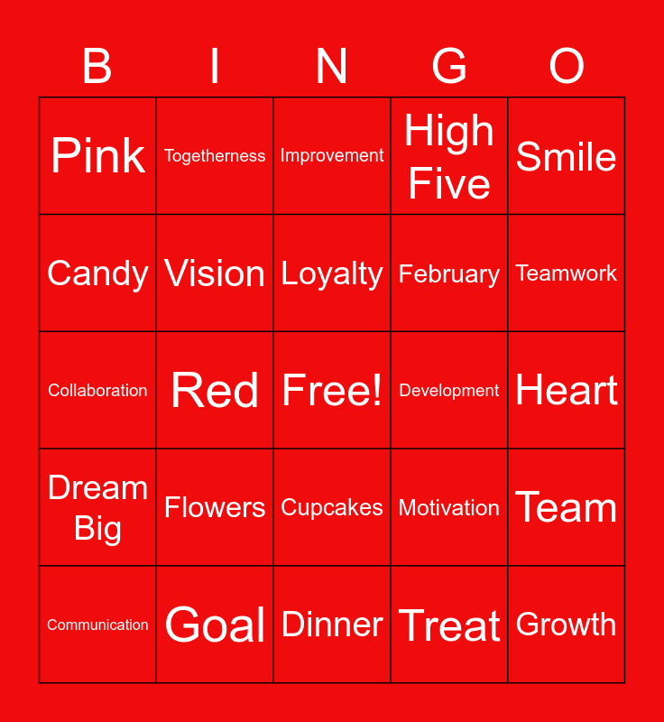 This bingo card has a free space and 67 words: Valentine's Day, Appreciation, Friendship, Team, Thank you, Chocolate, Togetherness, Support, Loyalty, Colleagues, Cupcakes, Shine, Heart, Smile, Cupid, Candy, Red, Pink, White, February, Flowers, Dream Big, High Five, Treat, Sweet, Card, Roses, Fourteen, Teamwork, Bonding, Growth, Friends, Family, Co-workers, Team Building, Communication, Cooperation, Motivation, Collaboration, Leadership, Group, Vision, Development, Love, Success, Unity, Trust, Goal, Learning, Positive, Improvement, Hug, Feelings, Movies, Bear, Dinner, Balloons, Gift, Poem, Special, Holiday, Arrows, Fun, Share, Thoughtful, Happiness and Kindness.