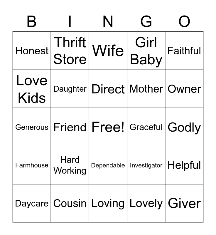 This bingo card has 1 images, a free space and 38 words: Beautiful, Clean, Daughter, Daycare, Dependable, Direct, Elegant, Faithful, Farmhouse, Friend, Girl Baby, Giver, Godly, Graceful, Hard Working, Helpmate, Honest, Intelligent, Investigator, Love Kids, Loving, Mother, Owner, Prayer Warrior, Respectful, Rustic, Shopaholic, Sister, Thrift Store, Thrifty, Virtuous, Wife, Cousin, Lovely, Giving, Helpful, Generous and Particular.