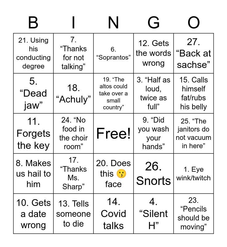 This bingo card has a free space and 28 words: 1. Eye wink/twitch, 2. Does the McGuire jump, 3. “Half as loud, twice as full”, 4. “Silent H”, 5. “Dead jaw”, 6. “Soprantos”, 7. “Thanks for not talking”, 8. Makes us hail to him, 9. “Did you wash your hands”, 10. Gets a date wrong, 11. Forgets the key, 12. Gets the words wrong, 13. Tells someone to die, 14. Covid talks, 15. Calls himself fat/rubs his belly, 16. Mentions being gluten free, 17. “Thanks Ms. Sharp”, 18. “Achuly”, 19. “The altos could take over a small country”, 20. Does this 😗 face, 21. Using his conducting degree, 22. Talks about his church choir, 23. “Pencils should be moving”, 24. “No food in the choir room”, 25. “The janitors do not vacuum in here”, 26. Snorts, 27. “Back at sachse” and 28. Mentions his age.