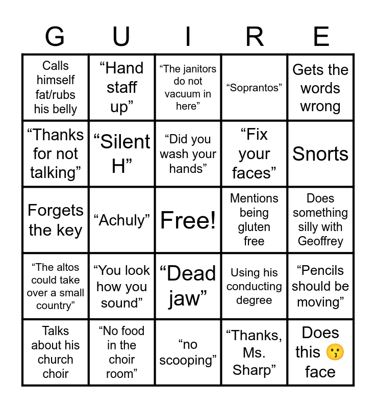 This bingo card has a free space and 35 words: Eye wink/twitch, Does the McGuire jump, “Half as loud, twice as full”, “Silent H”, “Dead jaw”, “Soprantos”, “Thanks for not talking”, Makes us hail to him, “Did you wash your hands”, Gets a date wrong, Forgets the key, Gets the words wrong, Tells someone to die, Covid talks, Calls himself fat/rubs his belly, Mentions being gluten free, “Thanks, Ms. Sharp”, “Achuly”, “The altos could take over a small country”, Does this 😗 face, Using his conducting degree, Talks about his church choir, “Pencils should be moving”, “No food in the choir room”, “The janitors do not vacuum in here”, Snorts, “Back at Sachse”, Mentions his age, “Fix your faces”, Does something silly with Geoffrey, “and I’m talking too much… Let’s go!”, “no scooping”, “You look how you sound”, “Hand staff up” and “I need everyone to be using hand signs right now”.