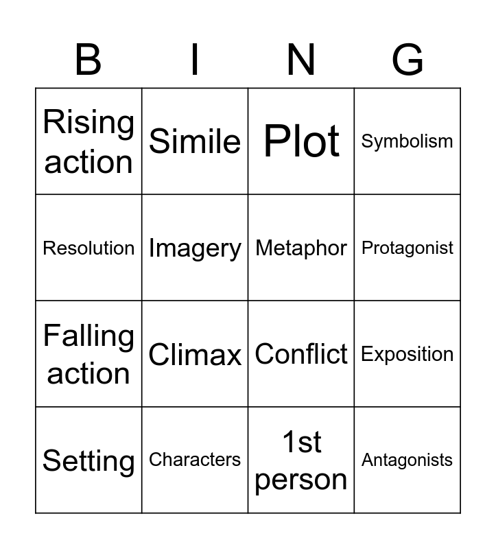 This bingo card has 17 words: 1st person, Setting, Plot, Rising action, Climax, Symbolism, Exposition, Metaphor, Protagonist, Imagery, Characters, Conflict, Resolution, Simile, Falling action, Theme and Antagonists.