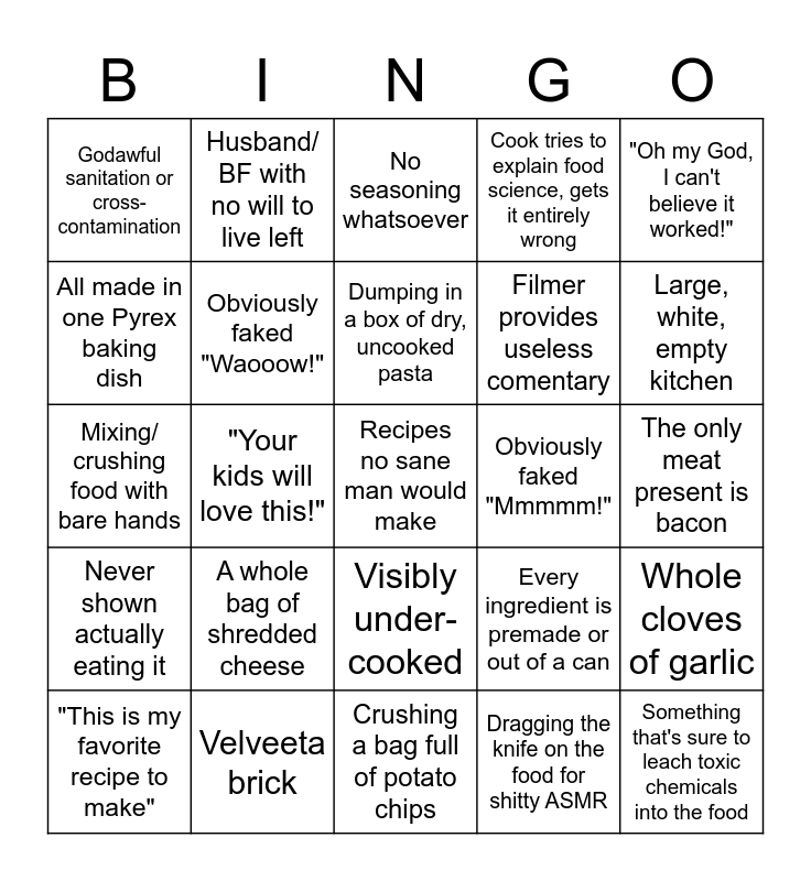 This bingo card has a free space and 24 words: A whole bag of shredded cheese, Velveeta brick, Dumping in a box of dry, uncooked pasta, "This is my favorite recipe to make", "Oh my God, I can't believe it worked!", Godawful sanitation or cross-contamination, All made in one Pyrex baking dish, Husband/ BF with no will to live left, Obviously faked "Mmmmm!", Visibly under-cooked, Filmer provides useless comentary, Mixing/ crushing food with bare hands, Every ingredient is premade or out of a can, Whole cloves of garlic, Obviously faked "Waooow!", Dragging the knife on the food for shitty ASMR, The only meat present is bacon, No seasoning whatsoever, Large, white, empty kitchen, "Your kids will love this!", Something that's sure to leach toxic chemicals into the food, Never shown actually eating it, Cook tries to explain food science, gets it entirely wrong and Crushing a bag full of potato chips.
