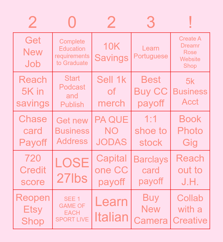 This bingo card has a free space and 24 words: LOSE 27lbs, SEE 1 GAME OF EACH SPORT LIVE, Sell 1k of merch, Reopen Etsy Shop, Create A Dreamr Rose Website Shop, Get New Job, Reach 5K in savings, Complete Education requirements to Graduate, 1:1 shoe to stock, Capital one CC payoff, Best Buy CC payoff, Chase card Payoff, Barclays card payoff, Reach out to J.H., Start Podcast and Publish, Buy New Camera, Book Photo Gig, 10K Savings, 5k Business Acct, Get new Business Address, Collab with a Creative, 720 Credit score, Learn Portuguese and Learn Italian.