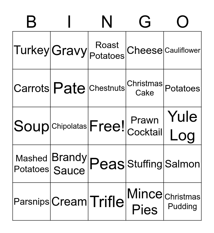 This bingo card has a free space and 24 words: Brandy Sauce, Cream, Chestnuts, Parsnips, Cauliflower, Turkey, Carrots, Gravy, Prawn Cocktail, Peas, Christmas Cake, Soup, Stuffing, Salmon, Pate, Mince Pies, Yule Log, Roast Potatoes, Potatoes, Chipolatas, Christmas Pudding, Mashed Potatoes, Cheese and Trifle.