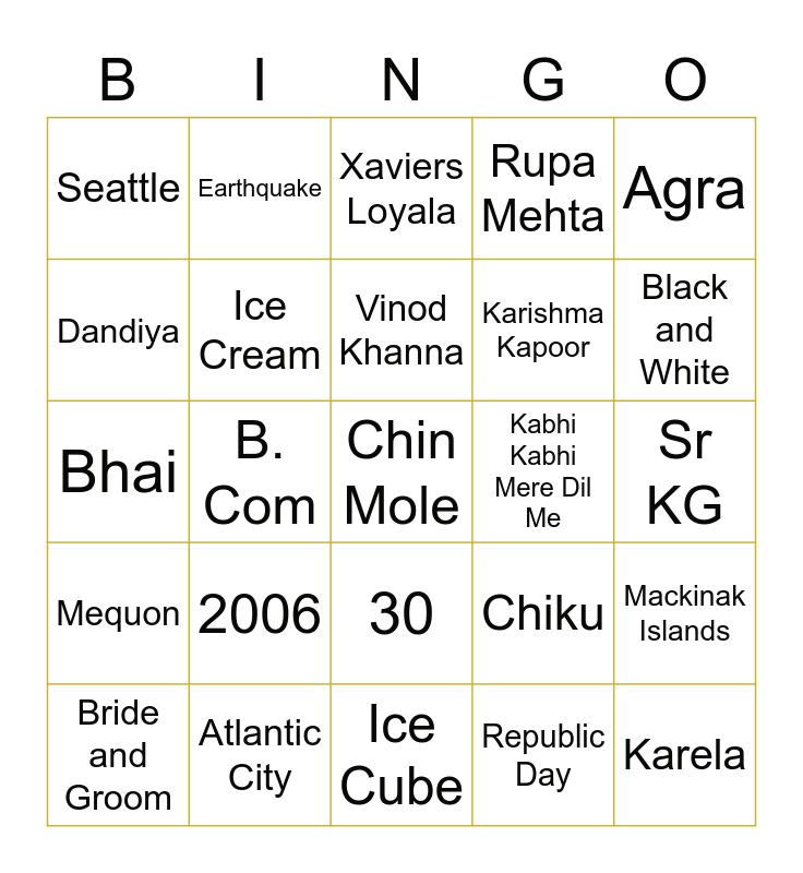This bingo card has 41 words: Khodidas, Bhai, Khus, Ice Cream, Atlantic City, 30, Vinod Khanna, 24, Agra, Mequon, B. Com, Rupa Mehta, Chin Mole, Sr KG, Kabhi Kabhi Mere Dil Me, 2006, Scotch, Seattle, Sarita Udhyan, Xaviers Loyala, Mackinak Islands, Karela, Ice Cube, Karishma Kapoor, Yellow, Apple, Republic Day, Morning "walk" (breakfast) with friends, Black and White, 1987, HA, Earthquake, Bride and Groom, Bhel, Chiku, Dandiya, 3, Italian chain, Ambala, Green and Lubriderm Red.