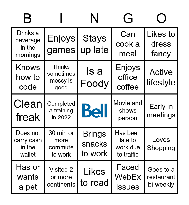 This bingo card has a free space and 24 words: 30 min or more commute to work, Visited 2 or more continents, Is a Foody, Has or wants a pet, Likes to dress fancy, Drinks a beverage in the mornings, Knows how to code, Enjoys games, Movie and shows person, Brings snacks to work, Enjoys office coffee, Clean freak, Has been late to work due to traffic, Loves Shopping, Thinks sometimes messy is good, Faced WebEx issues, Early in meetings, Stays up late, Active lifestyle, Completed a training in 2022, Goes to a restaurant bi-weekly, Does not carry cash in the wallet, Can cook a meal and Likes to read.