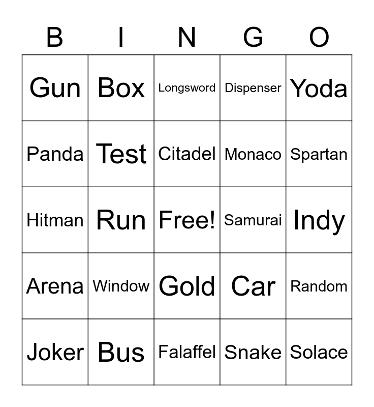This bingo card has a free space and 26 words: Gold, Snake, Citadel, Bus, Yoda, Gun, Panda, Box, Indy, Car, Monaco, Hitman, Random, Joker, Run, Ragdoll, Dispenser, Arena, Longsword, Solace, Spartan, Falaffel, Samurai, Window, Test and Check.