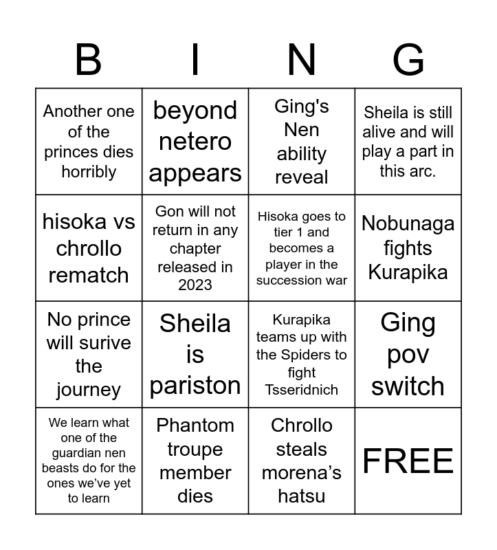 This bingo card has 16 words: Phantom troupe member dies, Ging pov switch, Ging's Nen ability reveal, Another one of the princes dies horribly, No prince will surive the journey, beyond netero appears, Kurapika teams up with the Spiders to fight Tsseridnich, Chrollo steals morena’s hatsu, hisoka vs chrollo rematch, Gon will not return in any chapter released in 2023, We learn what one of the guardian nen beasts do for the ones we’ve yet to learn, Sheila is still alive and will play a part in this arc., Sheila is pariston, Nobunaga fights Kurapika, Hisoka goes to tier 1 and becomes a player in the succession war and FREE.