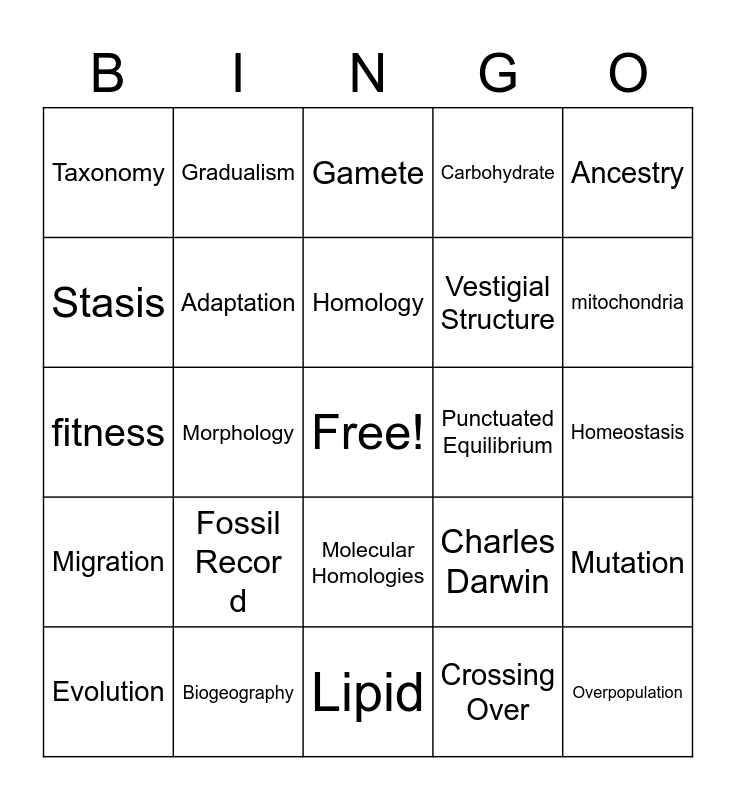 This bingo card has a free space and 24 words: Fossil Recor d, Biogeography, Homology, Evolution, Ancestry, Taxonomy, Stasis, Gradualism, Punctuated Equilibrium, Molecular Homologies, Vestigial Structure, fitness, Charles Darwin, Mutation, Adaptation, Crossing Over, Homeostasis, Gamete, mitochondria, Morphology, Overpopulation, Migration, Carbohydrate and Lipid.