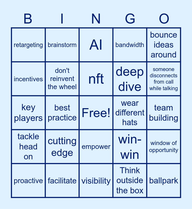 This bingo card has a free space and 32 words: Think outside the box, synergy, best practice, going forward, tackle head on, don't reinvent the wheel, bounce ideas around, window of opportunity, brainstorm, viral marketing, nft, AI, no-brainer, awkward pause, wear different hats, elevate, proactive, key players, empower, cutting edge, win-win, big picture, team building, facilitate, ballpark, bandwidth, deep dive, incentives, retargeting, visibility, new studio joins the family and someone disconnects from call while talking.