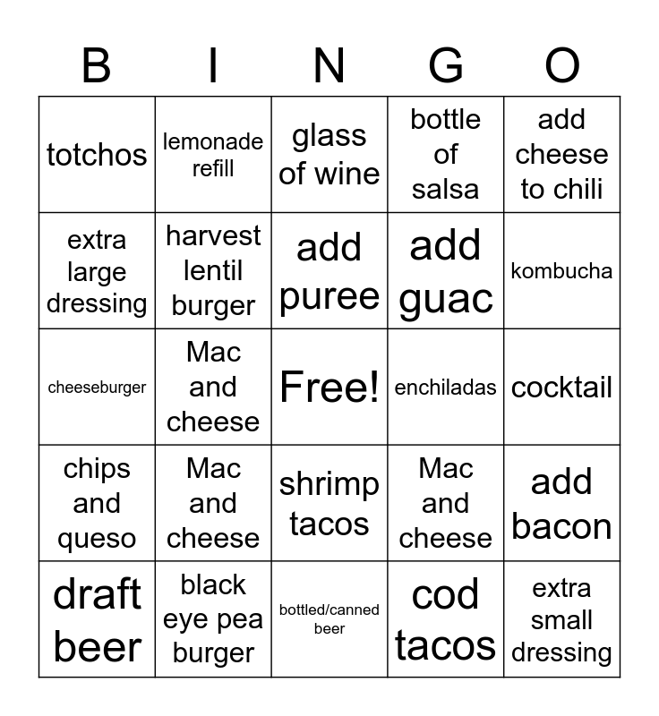 This bingo card has a free space and 24 words: Mac and cheese, black eye pea burger, add puree, draft beer, add cheese to chili, totchos, extra large dressing, lemonade refill, enchiladas, shrimp tacos, add guac, cheeseburger, Mac and cheese, add bacon, harvest lentil burger, cod tacos, cocktail, glass of wine, kombucha, Mac and cheese, extra small dressing, chips and queso, bottle of salsa and bottled/canned beer.