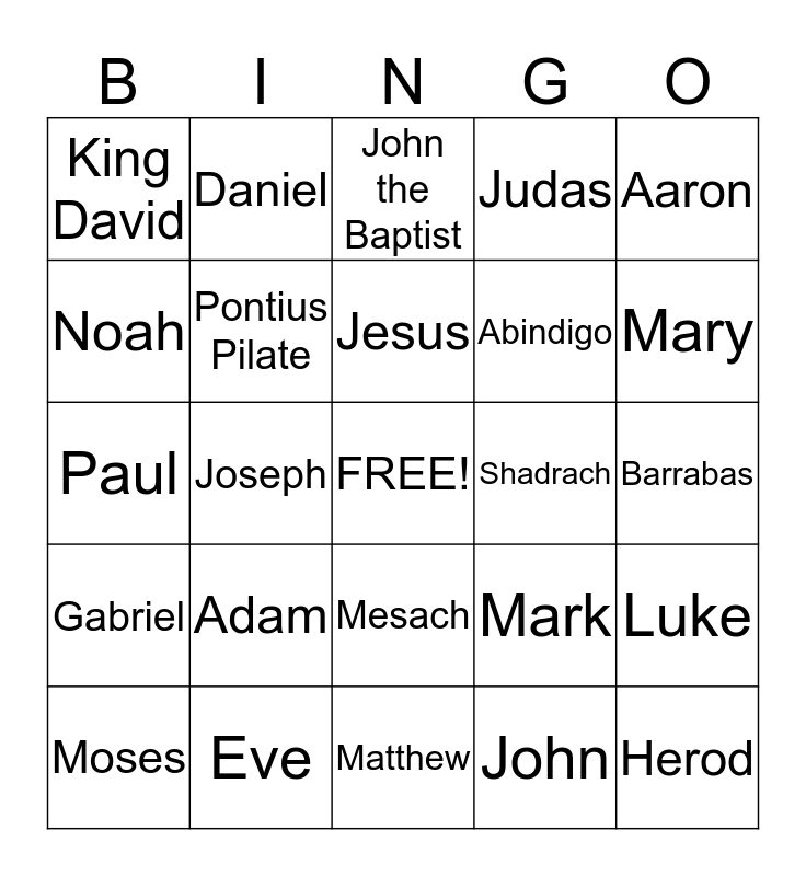 This bingo card has a free space and 24 words: Adam, Eve, Jesus, Moses, Aaron, King David, Noah, Daniel, Shadrach, Mesach, Abindigo, Paul, Mark, Luke, Pontius Pilate, John, Barrabas, John the Baptist, Mary, Joseph, Herod, Gabriel, Judas and Matthew.