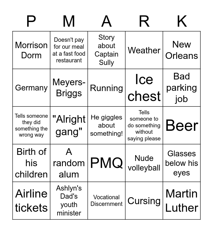 This bingo card has a free space and 29 words: Airline tickets, Miami internship, "Alright gang", Story about travel issues, Morrison Dorm, Story about Captain Sully, Meyers-Briggs, A random alum, Tells someone to do something without saying please, Ashlyn's Dad's youth minister, Beer, Martin Luther, Vocational Discernment, Cursing, Bad parking job, UNC basketball, PMQ, Birth of his children, New Orleans, Tells someone they did something the wrong way, Nude volleyball, Complains about another driver, Ice chest, Germany, Weather, Doesn't pay for our meal at a fast food restaurant, Glasses below his eyes, Running and Building his garage.