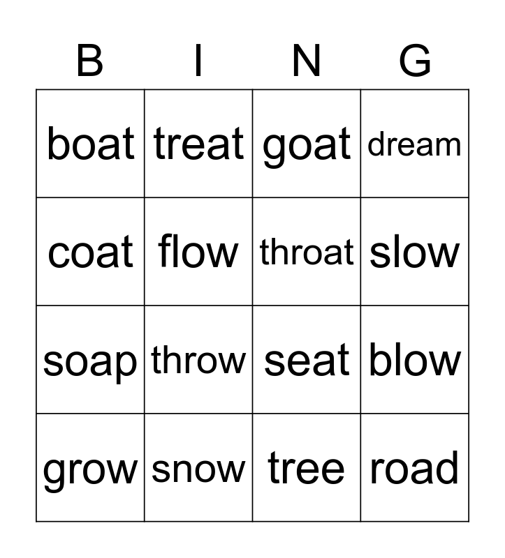 This bingo card has 16 words: snow, blow, goat, boat, soap, treat, seat, tree, coat, flow, grow, dream, throw, slow, throat and road.