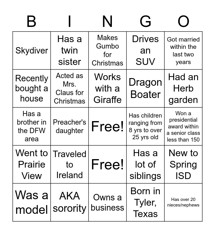 This bingo card has a free space and 24 words: Was a model, Traveled to Ireland, Works with a Giraffe, Born in Tyler, Texas, Got married within the last two years, Skydiver, Has a twin sister, Makes Gumbo for Christmas, Has children ranging from 8 yrs to over 25 yrs old, Won a presidential award within a senior class less than 150, Has a brother in the DFW area, Acted as Mrs. Claus for Christmas, Has a lot of siblings, New to Spring ISD, Recently bought a house, AKA sorority, Owns a business, Drives an SUV, Had an Herb garden, Went to Prairie View, Preacher's daughter, Free!, Dragon Boater and Has over 20 nieces/nephews.