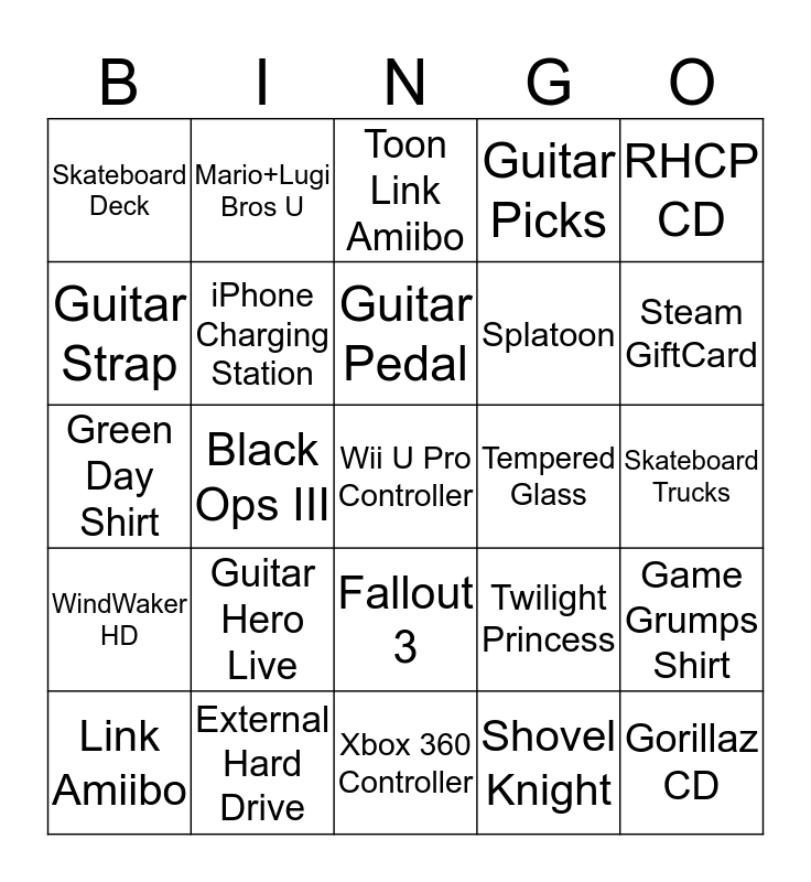 This bingo card has a free space and 24 words: Guitar Hero Live, External Hard Drive, Guitar Pedal, Link Amiibo, RHCP CD, Skateboard Deck, Guitar Strap, Mario+Lugi Bros U, Tempered Glass, Fallout 3, Splatoon, Green Day Shirt, Twilight Princess, Game Grumps Shirt, iPhone Charging Station, Shovel Knight, Skateboard Trucks, Toon Link Amiibo, Steam GiftCard, Black Ops III, Gorillaz CD, WindWaker HD, Guitar Picks and Xbox 360 Controller.
