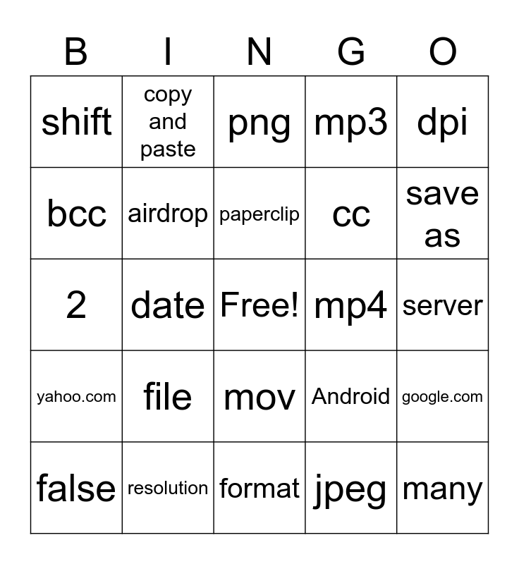 This bingo card has a free space and 45 words: one, many, true, false, sound, jpeg, png, gif, dpi, resolution, mp3, mp4, mov, file, edit, format, 4, 2, hyperlink, save as, copy and paste, photos, control, shift, command, server, java, IOS, Android, yahoo.com, chrome, google.com, desktop, dock, name, date, size, kind, screencaSt, paperclip, bcc, cc, compress, airdrop and logout.