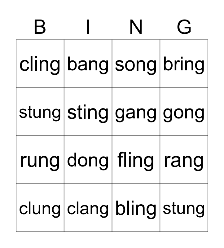This bingo card has 20 words: rang, sing, song, thing, clung, stung, clang, cling, rung, bang, dong, fling, sting, stung, gang, fang, gong, bring, bling and flung.