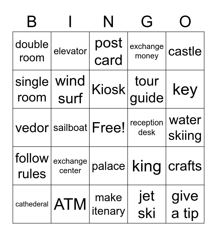 This bingo card has a free space and 24 words: exchange center, ATM, Kiosk, cathederal, castle, double room, single room, elevator, reception desk, palace, tour guide, vedor, king, crafts, wind surf, jet ski, water skiing, post card, key, sailboat, give a tip, follow rules, exchange money and make itenary.