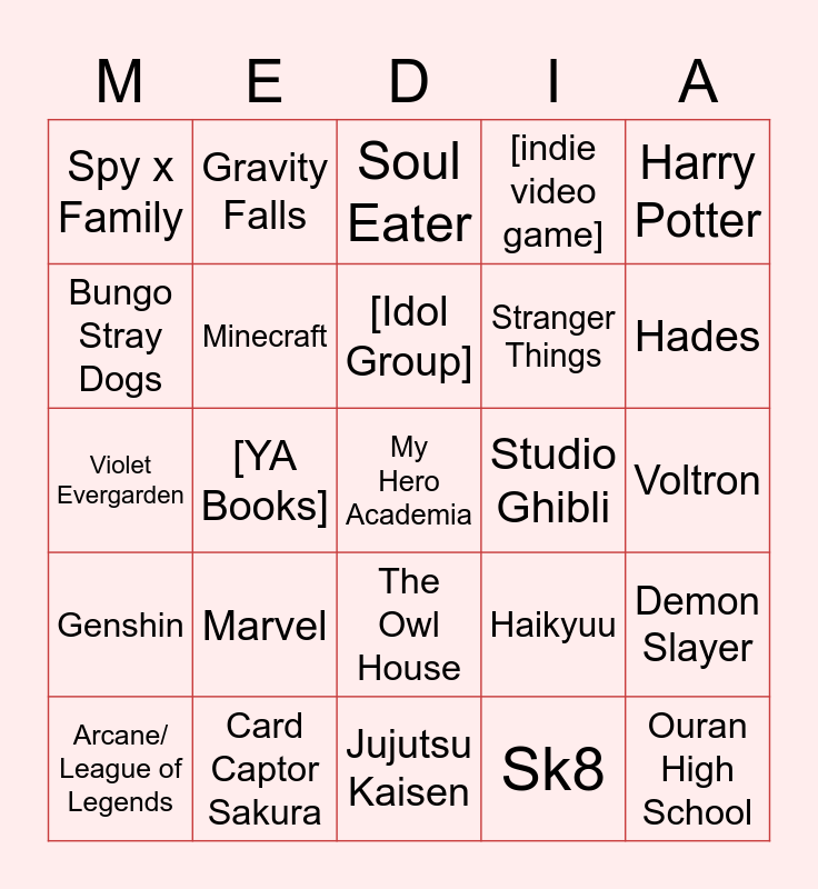 This bingo card has a free space and 46 words: Chainsaw Man, Ouran High School, MXTX/ Danmei, Jujutsu Kaisen, Marvel, DC Comics, Gravity Falls, Steven Universe, Bungo Stray Dogs, Pokemon, Minecraft, [indie video game], Demon Slayer, Haikyuu, Disney, Persona, [Idol Group], Studio Ghibli, Vocaloid, Harry Potter, [YA Books], Sk8, Spy x Family, Stranger Things, Avatar TLA, Hades, Arcane/ League of Legends, Undertale, The Owl House, Genshin, Overwatch, [online shooter], [AAA Game], Legend of Zelda, Sailor Moon, Card Captor Sakura, Voltron, Seraph of the End, [Musical], Dangan rompa, Yuri!!! on ICE, Soul Eater, Violet Evergarden, Toilet bound Hanako, She-ra and 5 Nights At Freddies.