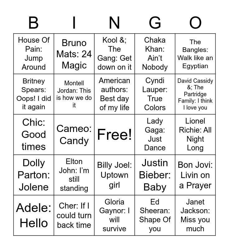 This bingo card has a free space and 29 words: Adele: Hello, Beach Boys: Surfin USA, Cameo: Candy, Beyonce: Single ladies, House Of Pain: Jump Around, Kool &; The Gang: Get down on it, Montell Jordan: This is how we do it, Elton John: I’m still standing, Lady Gaga: Just Dance, Cher: If I could turn back time, Lionel Richie: All Night Long, Janet Jackson: Miss you much, Gloria Gaynor: I will survive, Ed Sheeran: Shape Of you, David Cassidy &; The Partridge Family: I think I love you, John Mayer: Waiting on the World to change, Billy Joel: Uptown girl, Dolly Parton: Jolene, The Bangles: Walk like an Egyptian, Chic: Good times, Justin Bieber: Baby, Eminem: Without Me, Cyndi Lauper: True Colors, Britney Spears: Oops! I did it again, Chaka Khan: Ain’t Nobody, Bruno Mats: 24 Magic, Bon Jovi: Livin on a Prayer, American authors: Best day of my life and Carly Rae Jepsen: Call Me Maybe.