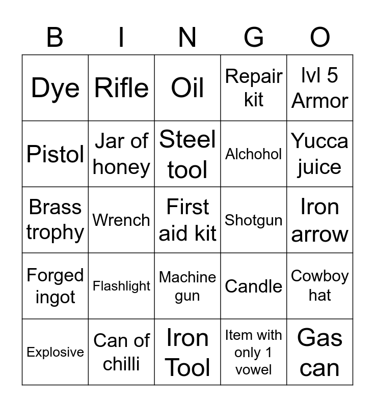 This bingo card has 25 words: Flashlight, Iron Tool, Steel tool, Explosive, lvl 5 Armor, Dye, Pistol, Rifle, Shotgun, Machine gun, Alchohol, Brass trophy, Candle, Cowboy hat, Jar of honey, Gas can, Iron arrow, Oil, Yucca juice, Wrench, First aid kit, Can of chilli, Forged ingot, Repair kit and Item with only 1 vowel.