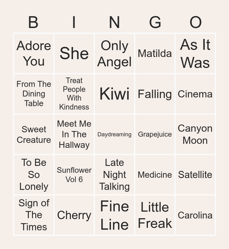 This bingo card has 25 words: Sunflower Vol 6, Fine Line, Kiwi, Sign of The Times, As It Was, Adore You, From The Dining Table, She, Grapejuice, Late Night Talking, Falling, Sweet Creature, Medicine, Satellite, Treat People With Kindness, Carolina, Canyon Moon, Only Angel, Cinema, Meet Me In The Hallway, Daydreaming, Cherry, To Be So Lonely, Matilda and Little Freak.