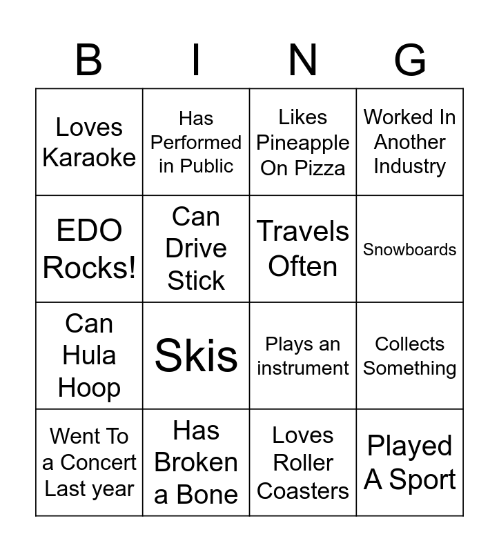This bingo card has 16 words: Has Broken a Bone, Collects Something, Likes Pineapple On Pizza, Loves Karaoke, Can Hula Hoop, Has Performed in Public, Plays an instrument, Loves Roller Coasters, EDO Rocks!, Can Drive Stick, Went To a Concert Last year, Worked In Another Industry, Skis, Snowboards, Travels Often and Played A Sport.