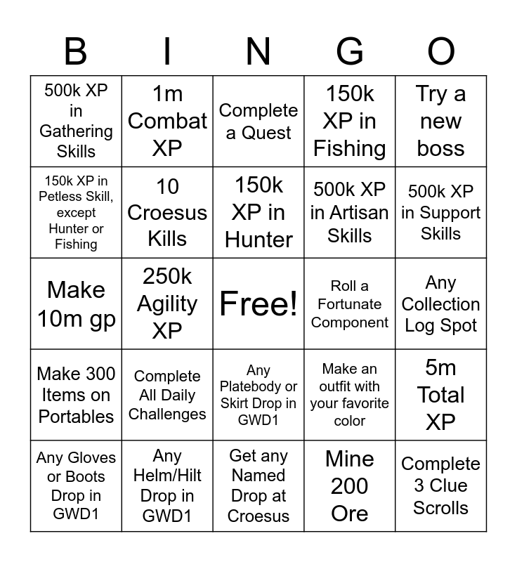 This bingo card has a free space and 24 words: Any Gloves or Boots Drop in GWD1, Complete All Daily Challenges, 150k XP in Hunter, Mine 200 Ore, Try a new boss, 500k XP in Gathering Skills, 1m Combat XP, Complete a Quest, Roll a Fortunate Component, Any Collection Log Spot, Make 10m gp, 10 Croesus Kills, Make an outfit with your favorite color, 5m Total XP, 150k XP in Petless Skill, except Hunter or Fishing, Any Helm/Hilt Drop in GWD1, Get any Named Drop at Croesus, 150k XP in Fishing, 500k XP in Support Skills, Make 300 Items on Portables, 250k Agility XP, Any Platebody or Skirt Drop in GWD1, 500k XP in Artisan Skills and Complete 3 Clue Scrolls.