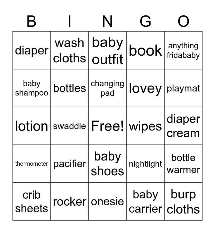 This bingo card has a free space and 24 words: pacifier, rocker, changing pad, crib sheets, anything fridababy, diaper, baby shampoo, wash cloths, wipes, baby shoes, lovey, lotion, nightlight, bottle warmer, bottles, baby carrier, diaper cream, baby outfit, playmat, swaddle, burp cloths, thermometer, book and onesie.