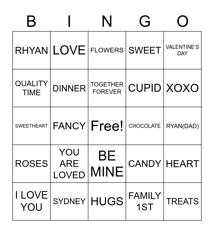 This bingo card has a free space and 24 words: YOU ARE LOVED, SYDNEY, TOGETHER FOREVER, I LOVE YOU, VALENTINE’S DAY, RHYAN, QUALITY TIME, LOVE, CHOCOLATE, BE MINE, CUPID, SWEETHEART, CANDY, HEART, DINNER, FAMILY 1ST, RYAN(DAD), FLOWERS, XOXO, FANCY, TREATS, ROSES, SWEET and HUGS.