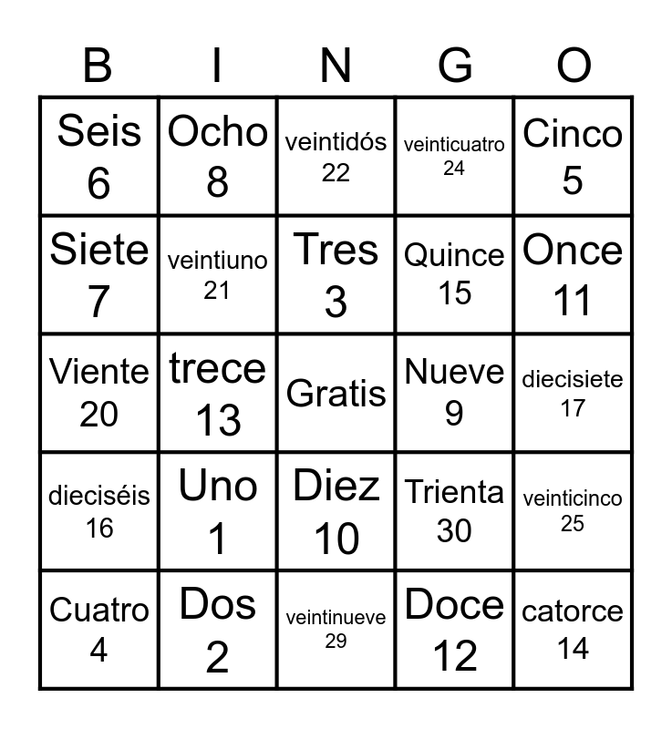 This bingo card has a free space and 24 words: Uno 1, Dos 2, Tres 3, Cuatro 4, Cinco 5, Seis 6, Siete 7, Ocho 8, Nueve 9, Diez 10, Quince 15, Viente 20, Trienta 30, veinticinco 25, veintiuno 21, Doce 12, diecisiete 17, veintidós 22, Once 11, trece 13, catorce 14, dieciséis 16, veinticuatro 24 and veintinueve 29.